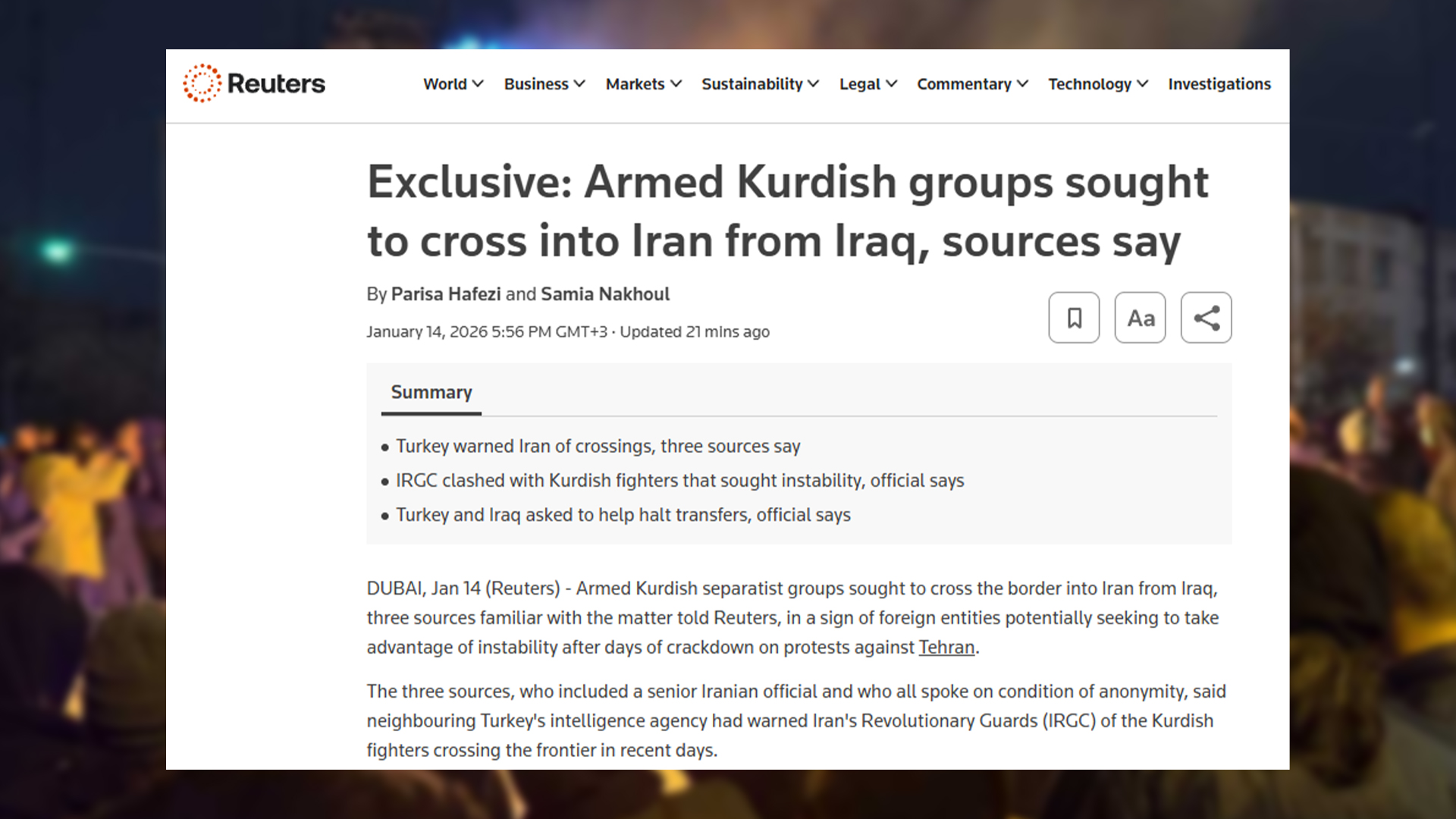 رۆیتەرز: گرووپە چەکدارە جوداخوازە کوردەكان لە عێراق و توركیاوە چوونەتە ئێرانەوە